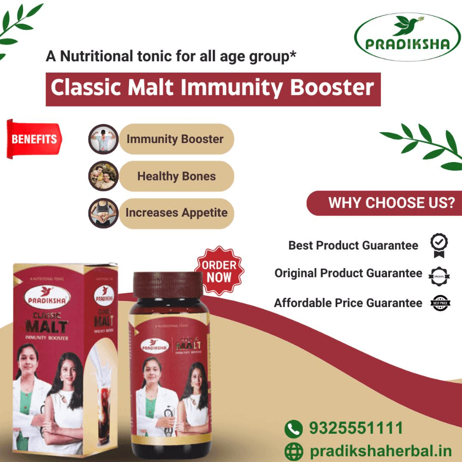 Pradiksha Classic Malt is a comprehensive health tonic designed to support and enhance overall well-being. Enriched with Ashwagandha, Shatavari, Musli, and Shankhpushpi, this malt offers a range of benefits including improved immunity, increased strength and stamina, and enhanced vitality. Ashwagandha, known for its stress-relieving and energy-boosting properties, helps in reducing anxiety and improving health. Shatavari supports menstrual health and boosts immunity, while Musli revitalizes and provides strength. Shankhpushpi improves memory and relieves stress, acting as a brain tonic. Additionally, Classic Malt serves as a natural antioxidant and appetite stimulator, making it a valuable supplement for individuals of all ages seeking to maintain optimal health and vitality.